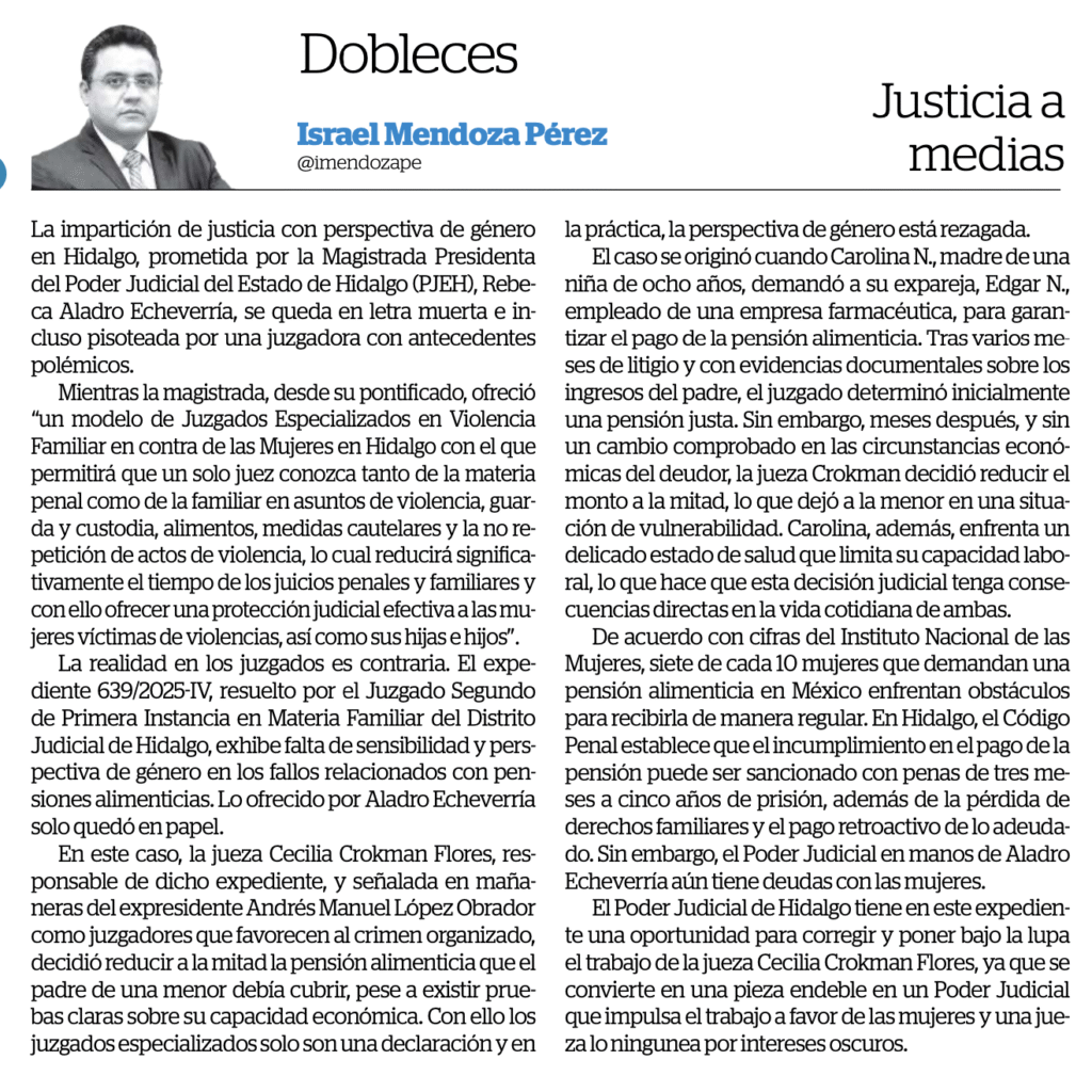 La realidad en los juzgados es contraria. El expe- diente 639/2025-IV, resuelto por el Juzgado Segundo de Primera Instancia en Materia Familiar del Distrito Judicial de Hidalgo, exhibe falta de sensibilidad y pers- pectiva de género en los fallos relacionados con pen- siones alimenticias. Lo ofrecido por Aladro Echeverría solo quedó en papel.