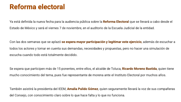 Ya está definida la nueva fecha para la audiencia pública sobre la Reforma Electoral que se llevará a cabo desde el Estado de México y será el viernes 7 de noviembre en el auditorio de la Escuela Judicial de la entidad.