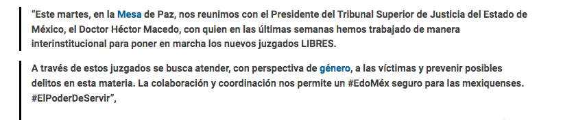 A través de estos juzgados se busca atender, con perspectiva de género, a las víctimas y prevenir posibles delitos en esta materia. La colaboración y coordinación nos permite un #EdoMéx seguro para las mexiquenses. #ElPoderDeServir”.