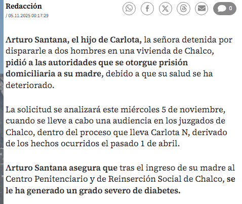 - https://www.milenio.com/policia/carlota-cuantos-anos-de-carcel-estaria-abuelita-disparos-chalco?fbclid=IwY2xjawN4bglleHRuA2FlbQIxMABicmlkETE0U0lKYmw4bGhnV3loalI3c3J0YwZhcHBfaWQQMjIyMDM5MTc4ODIwMDg5MgABHq-MQEbha2QYsAW4IzM73SvxzBV8Z3S-ogSZQGbg3g9W-d-JxFuRLjnQToEd_aem_f0ekhxp4XUH9RaPa_2bGdw