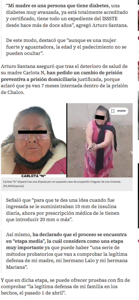 Arturo Santana, el hijo de Carlota, la señora detenida por dispararle a dos hombres en una vivienda de Chalco, pidió a las autoridades que se otorgue prisión domiciliaria a su madre, debido a que su salud se ha deteriorado.