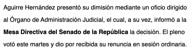 Aguirre Hernández presentó su dimisión mediante un oficio dirigido al Órgano de Administración Judicial, el cual, a su vez, informó a la Mesa Directiva del Senado de la República la decisión. El pleno votó este martes y dio por recibida su renuncia en sesión ordinaria.