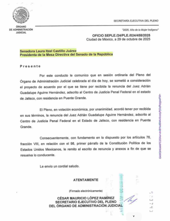 - https://www.jornada.com.mx/noticia/2025/11/04/politica/senado-recibe-primera-renuncia-de-juez-electo-tras-la-reforma-judicial
