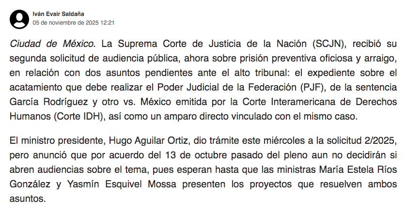 • https://www.jornada.com.mx/noticia/2025/11/05/politica/scjn-analiza-abrir-segunda-audiencia-publica-por-prision-preventiva-oficiosa-y-arraigo