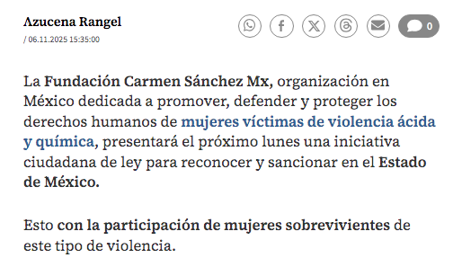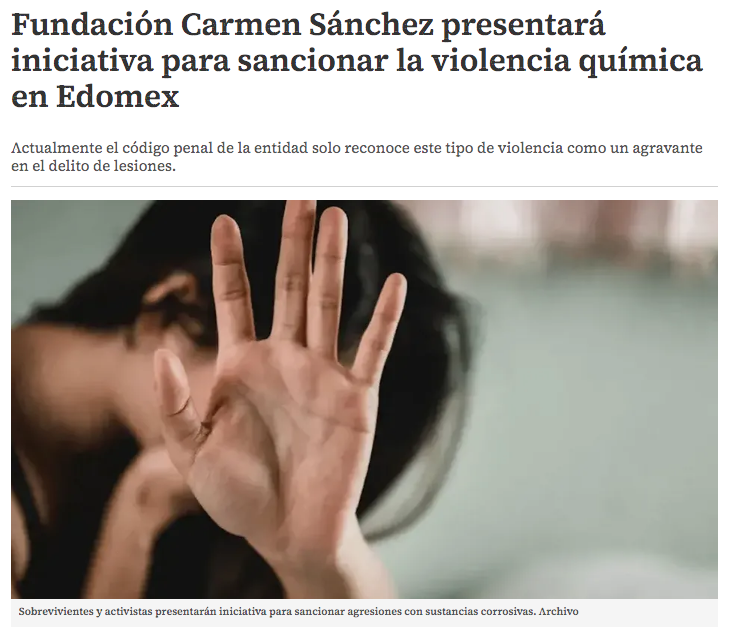 La Fundación Carmen Sánchez Mx, organización en México dedicada a promover, defender y proteger los derechos humanos de mujeres víctimas de violencia ácida y química, presentará el próximo lunes una iniciativa ciudadana de ley para reconocer y sancionar en el Estado de México.