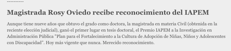 Aunque tiene nueve años que obtuvo el grado como doctora, la magistrada en materia Civil (obtenida en la reciente elección judicial), ganó el primer lugar en tesis doctoral, el Premio IAPEM a la Investigación en Administración Pública “Plan para el Fortalecimiento a la Cultura de Adopción de Niñas, Niños y Adolescentes con Discapacidad”. Hoy más vigente que nunca. Merecido reconocimiento.