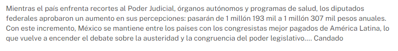 Mientras el país enfrenta recortes al Poder Judicial, órganos autónomos y programas de salud, los diputados federales aprobaron un aumento en sus percepciones: pasarán de 1 millón 193 mil a 1 millón 307 mil pesos anuales. Con este incremento, México se mantiene entre los países con los congresistas mejor pagados de América Latina, lo que vuelve a encender el debate sobre la austeridad y la congruencia del poder legislativo…. Candado
