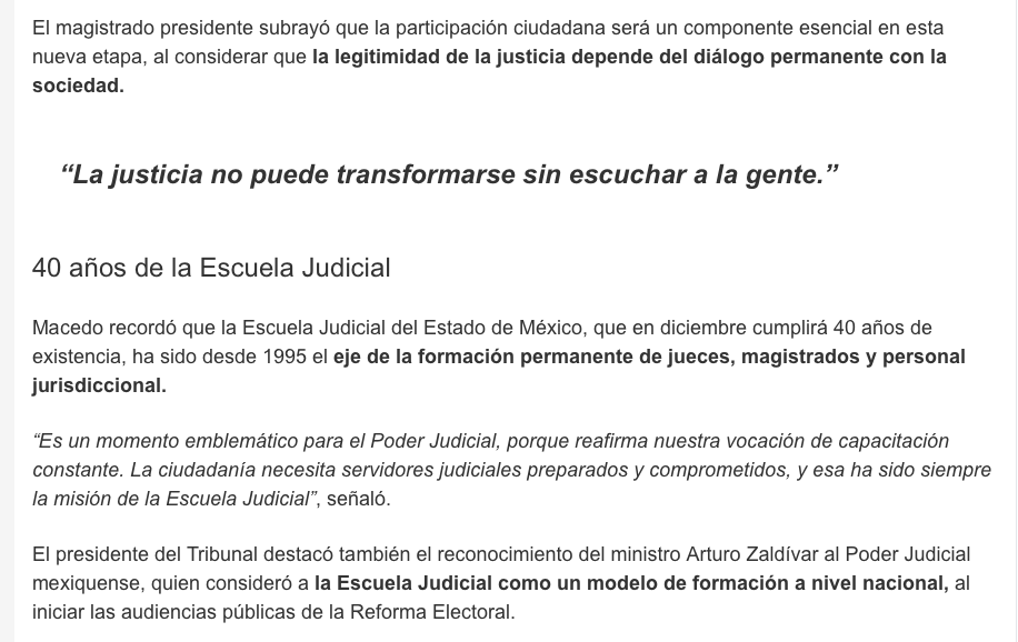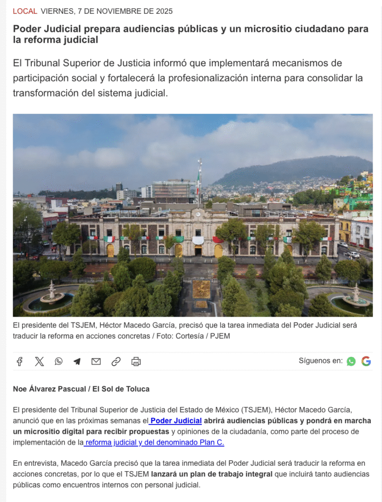 El presidente del Tribunal Superior de Justicia del Estado de México (TSJEM), Héctor Macedo García, anunció que en las próximas semanas el Poder Judicial abrirá audiencias públicas y pondrá en marcha un micrositio digital para recibir propuestas y opiniones de la ciudadanía, como parte del proceso de implementación de la reforma judicial y del denominado Plan C.