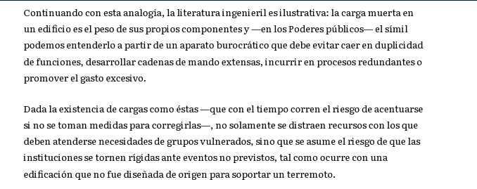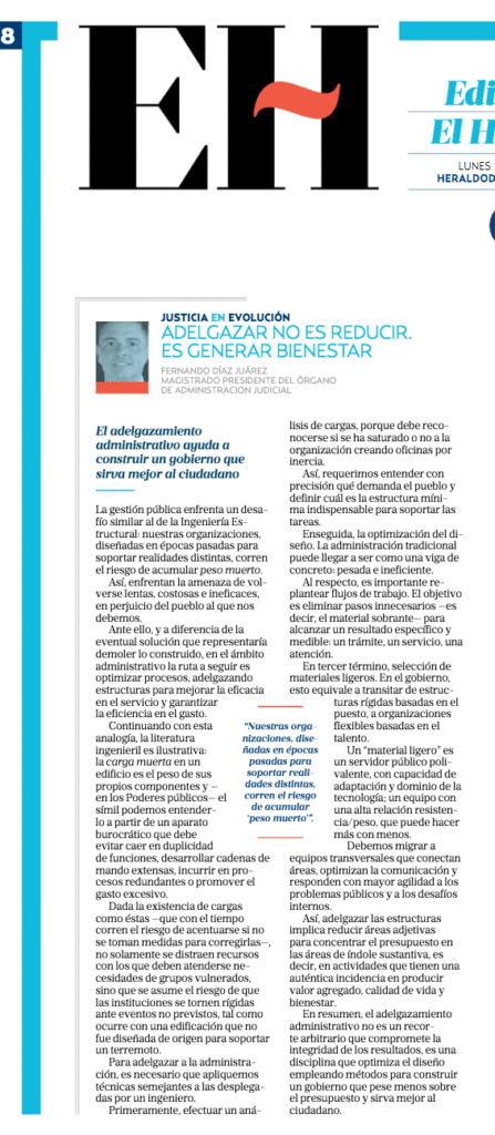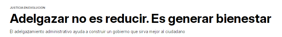 Así, enfrentan la amenaza de volverse lentas, costosas e ineficaces, en perjuicio del pueblo al que nos debemos. Ante ello, y a diferencia de la eventual solución que representaría demoler lo construido, en el ámbito administrativo la ruta a seguir es optimizar procesos, adelgazando estructuras para mejorar la eficacia en el servicio y garantizar la eficiencia en el gasto.