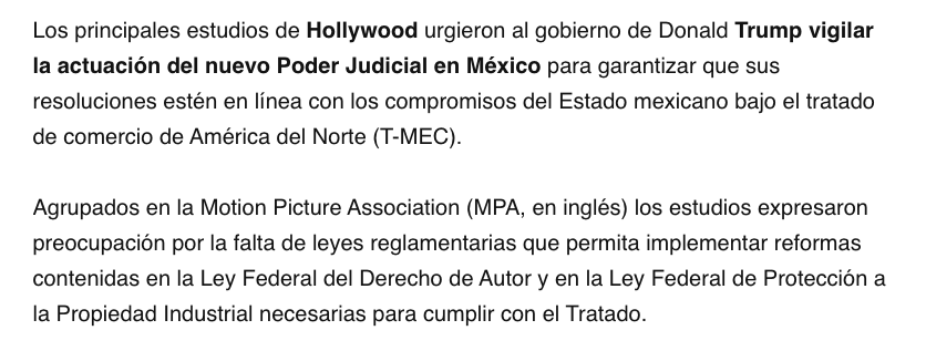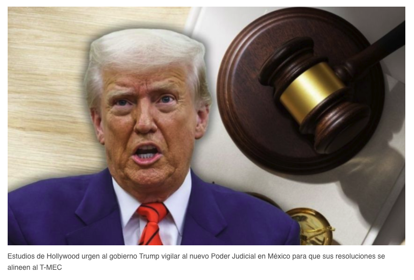 Los principales estudios de Hollywood urgieron al gobierno de Donald Trump vigilar la actuación del nuevo Poder Judicial en México para garantizar que sus resoluciones estén en línea con los compromisos del Estado mexicano bajo el tratado de comercio de América del Norte (T-MEC).