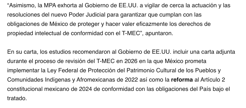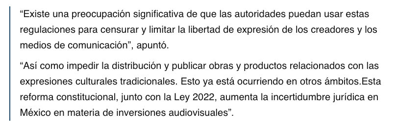 Agrupados en la Motion Picture Association (MPA, en inglés) los estudios expresaron preocupación por la falta de leyes reglamentarias que permita implementar reformas contenidas en la Ley Federal del Derecho de Autor y en la Ley Federal de Protección a la Propiedad Industrial necesarias para cumplir con el Tratado.