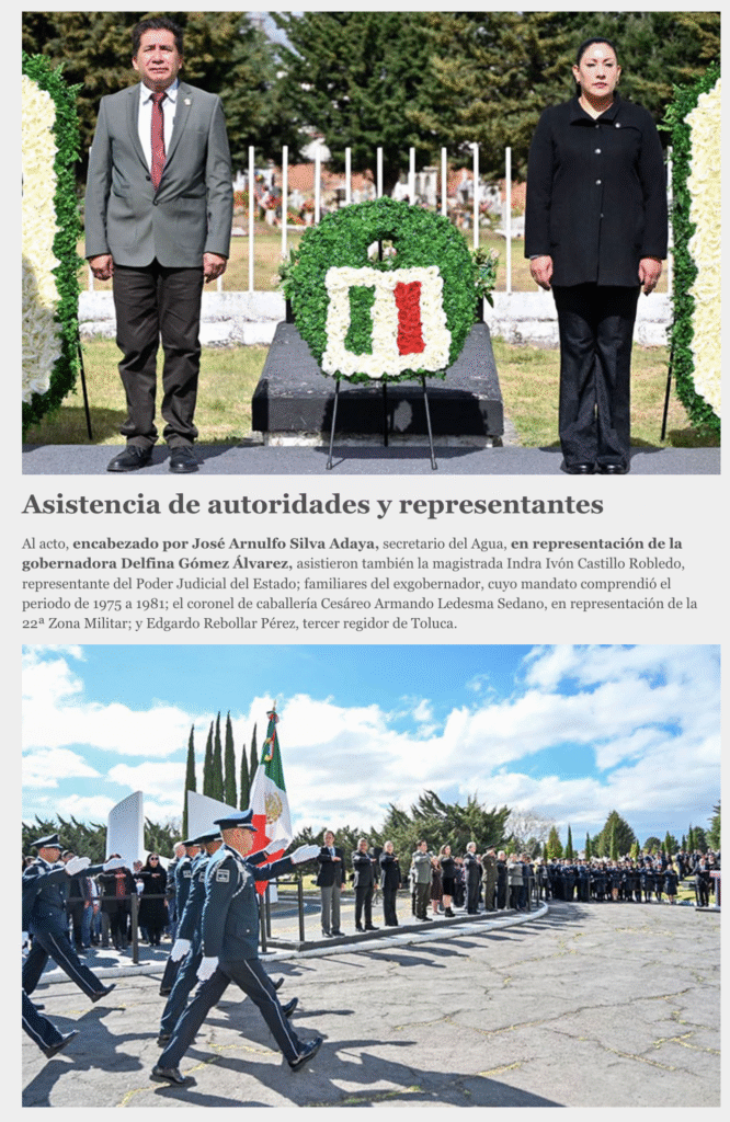 Al acto, encabezado por José Arnulfo Silva Adaya, secretario del Agua, en representación de la gobernadora Delfina Gómez Álvarez, asistieron también la magistrada Indra Ivón Castillo Robledo, representante del Poder Judicial del Estado; familiares del exgobernador, cuyo mandato comprendió el periodo de 1975 a 1981; el coronel de caballería Cesáreo Armando Ledesma Sedano, en representación de la 22ª Zona Militar; y Edgardo Rebollar Pérez, tercer regidor de Toluca.