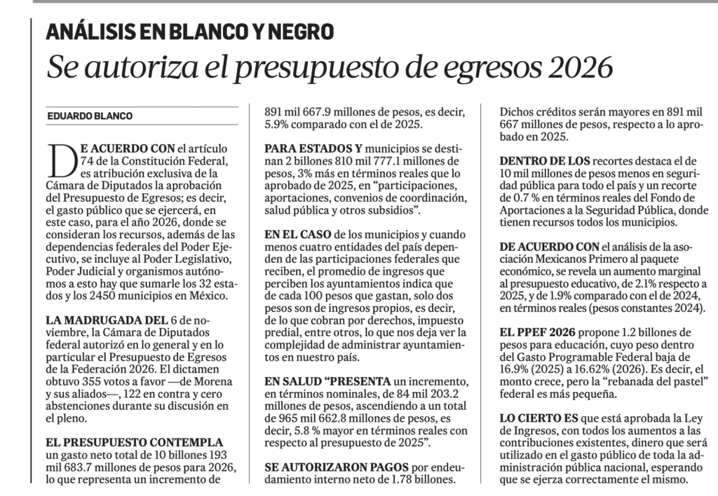 De acuerdo con el artículo 74 de la Constitución Federal, es atribución exclusiva de la Cámara de Diputados la aprobación del Presupuesto de Egresos, es decir el gasto público que se ejercerá en este caso para el año 2026, donde se consideran los recursos además de las dependencias federales del Poder Ejecutivo, se incluye al Poder Legislativo, Poder Judicial y organismos autónomos, a esto hay que sumarle los 32 estados y los 2450 municipios en México.