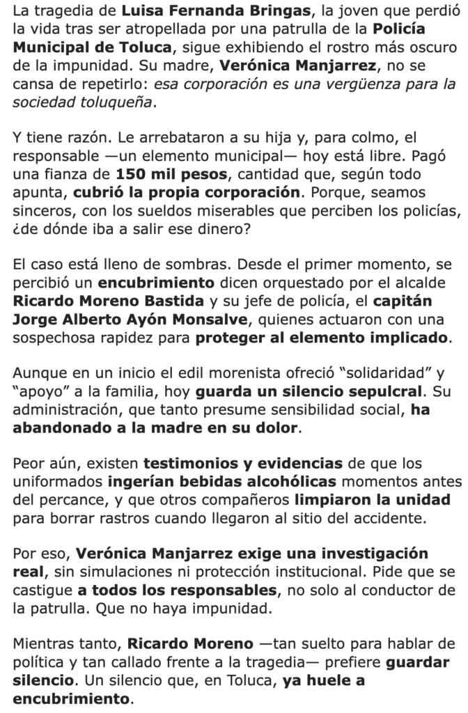 La tragedia de Luisa Fernanda Bringas, la joven que perdió la vida tras ser atropellada por una patrulla de la Policía Municipal de Toluca, sigue exhibiendo el rostro más oscuro de la impunidad. Su madre, Verónica Manjarrez, no se cansa de repetirlo: esa corporación es una vergüenza para la sociedad toluqueña.