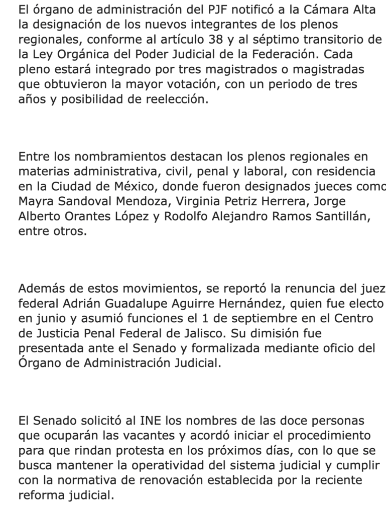 Doce magistrados de circuito que fueron electos el pasado 1 de junio dejaron sus cargos para integrarse como magistrados en los nuevos plenos regionales del Poder Judicial de la Federación (PJF), lo que generó vacantes que serán cubiertas por los aspirantes que obtuvieron el segundo lugar en las elecciones.