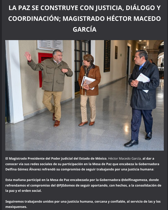 El Magistrado Presidente del Poder Judicial del Estado de México, Héctor Macedo García, al dar a conocer vía sus redes sociales de su participación en la Mesa de Paz que encabeza la Gobernadora Delfina Gómez Álvarez refrendó su compromiso de seguir trabajando por una justicia humana: