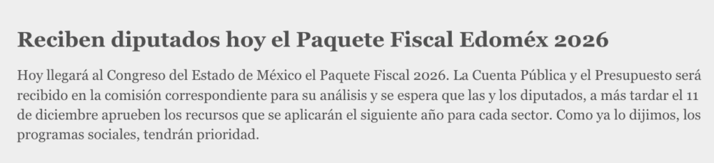 Hoy llegará al Congreso del Estado de México el Paquete Fiscal 2026. La Cuenta Pública y el Presupuesto será recibido en la comisión correspondiente para su análisis y se espera que las y los diputados, a más tardar el 11 de diciembre aprueben los recursos que se aplicarán el siguiente año para cada sector. Como ya lo dijimos, los programas sociales, tendrán prioridad.