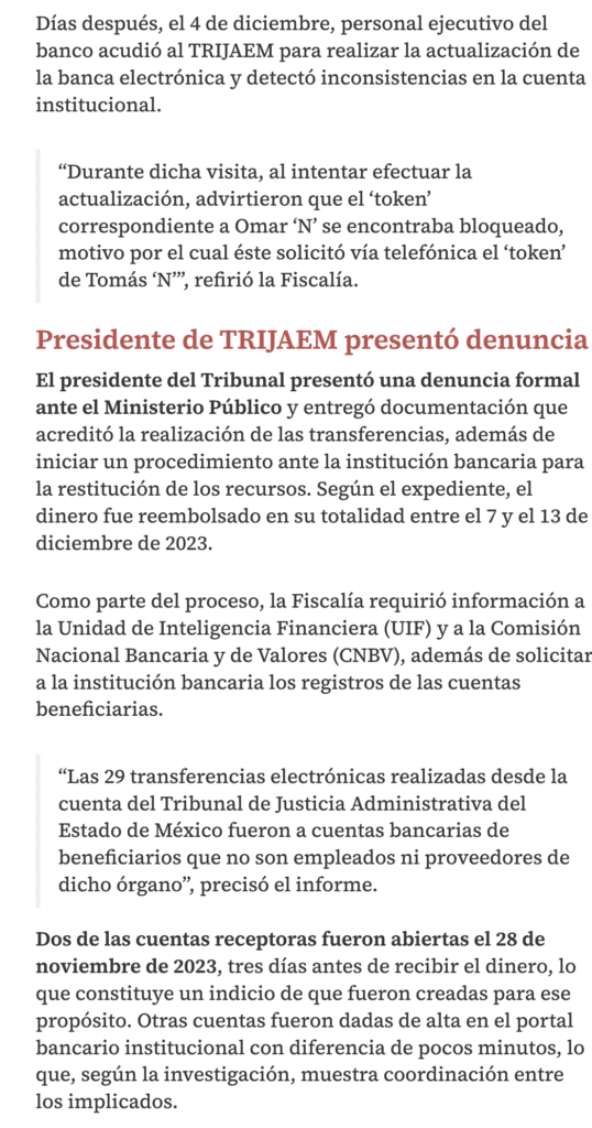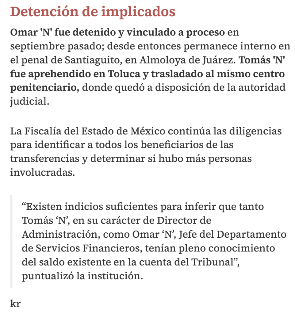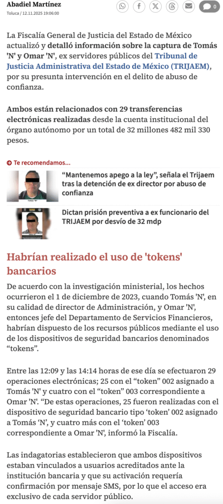 La Fiscalía General de Justicia del Estado de México actualizó y detalló información sobre la captura de Tomás ‘N’ y Omar ‘N’, ex servidores públicos del Tribunal de Justicia Administrativa del Estado de México (TRIJAEM), por su presunta intervención en el delito de abuso de confianza.
