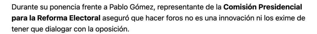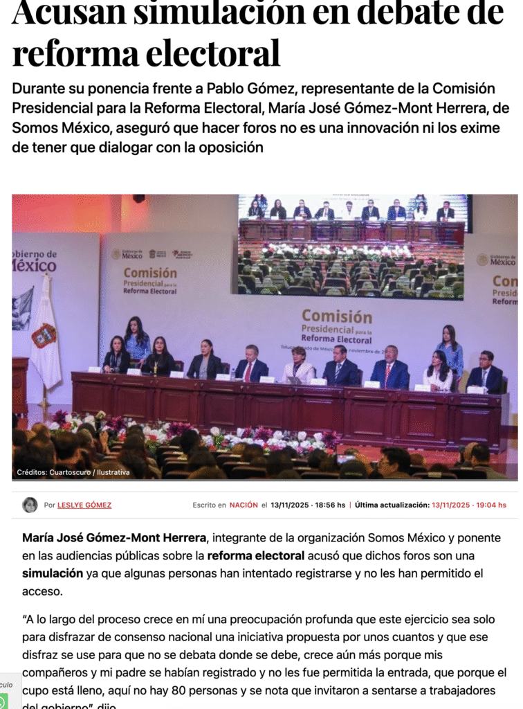 María José Gómez-Mont Herrera, integrante de la organización Somos México y ponente en las audiencias públicas sobre la reforma electoral acusó que dichos foros son una simulación ya que algunas personas han intentado registrarse y no les han permitido el acceso.