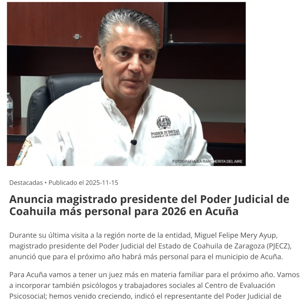 Durante su última visita a la región norte de la entidad, Miguel Felipe Mery Ayup, magistrado presidente del Poder Judicial del Estado de Coahuila de Zaragoza (PJECZ), anunció que para el próximo año habrá más personal para el municipio de Acuña.