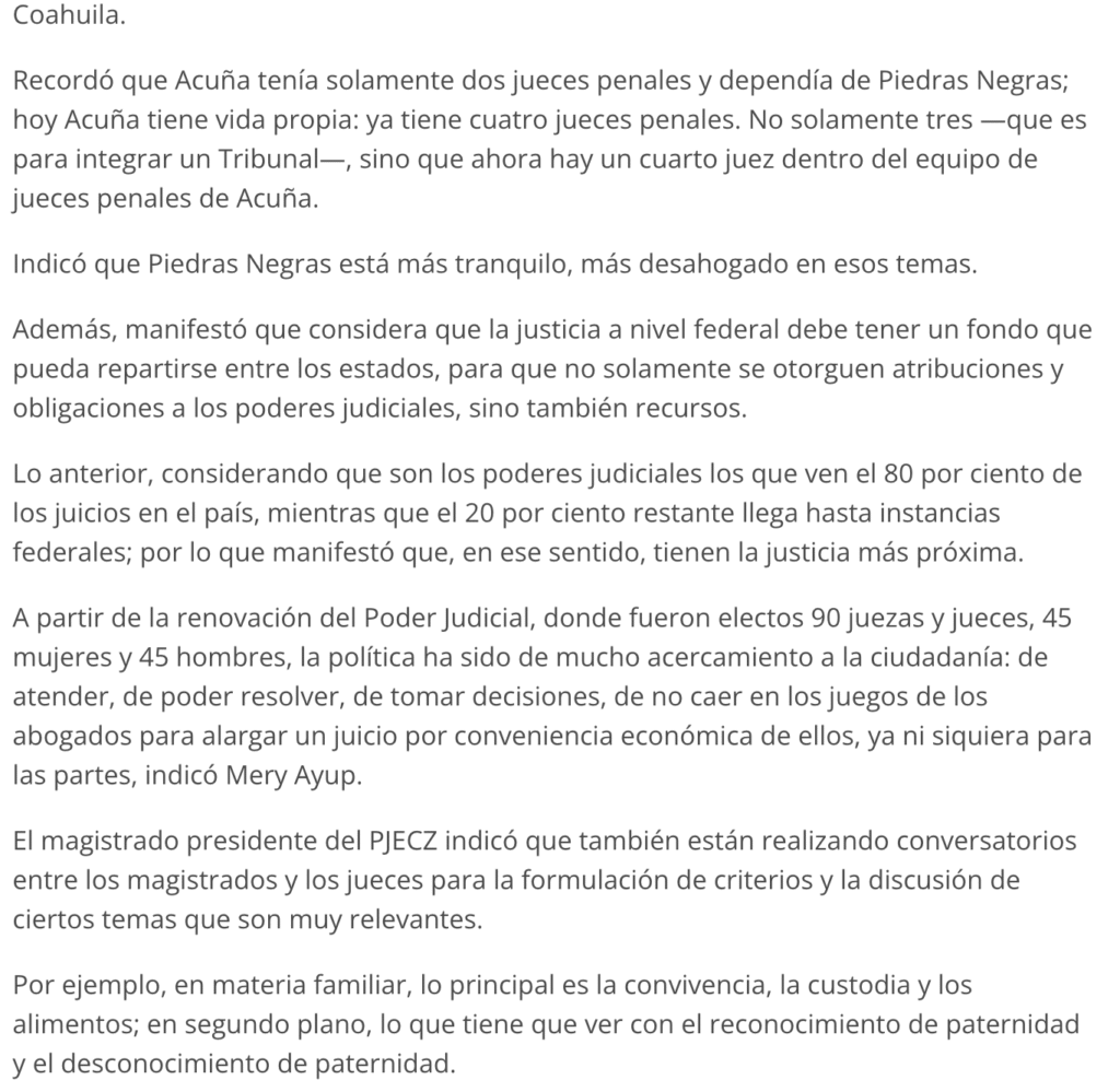 Para Acuña vamos a tener un juez más en materia familiar para el próximo año. Vamos a incorporar también psicólogos y trabajadores sociales al Centro de Evaluación Psicosocial; hemos venido creciendo, indicó el representante del Poder Judicial de Coahuila.
