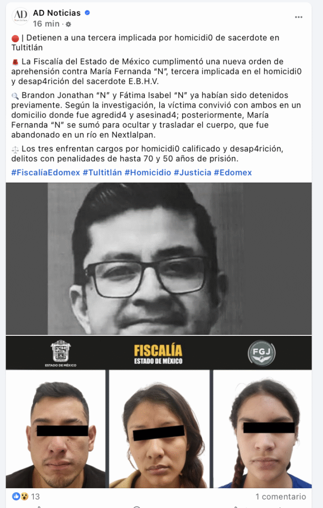 La Fiscalía del Estado de México cumplimentó una nueva orden de aprehensión contra María Fernanda “N”, tercera implicada en el homicidi0 y desap4rición del sacerdote E.B.H.V.