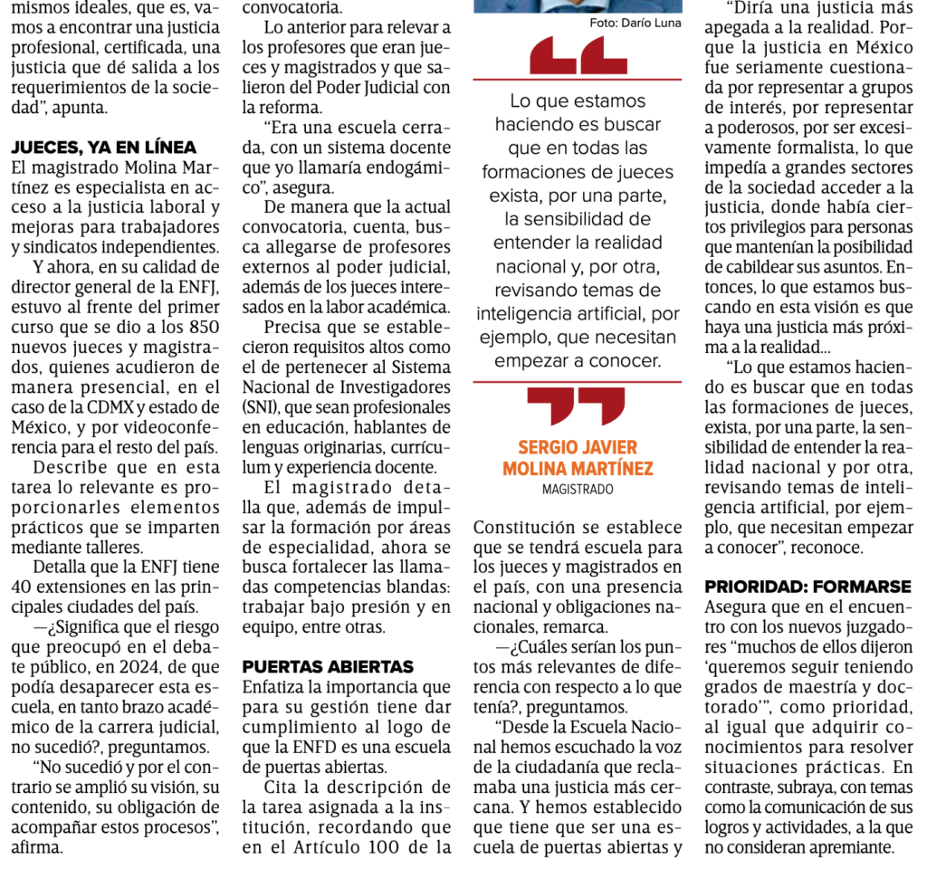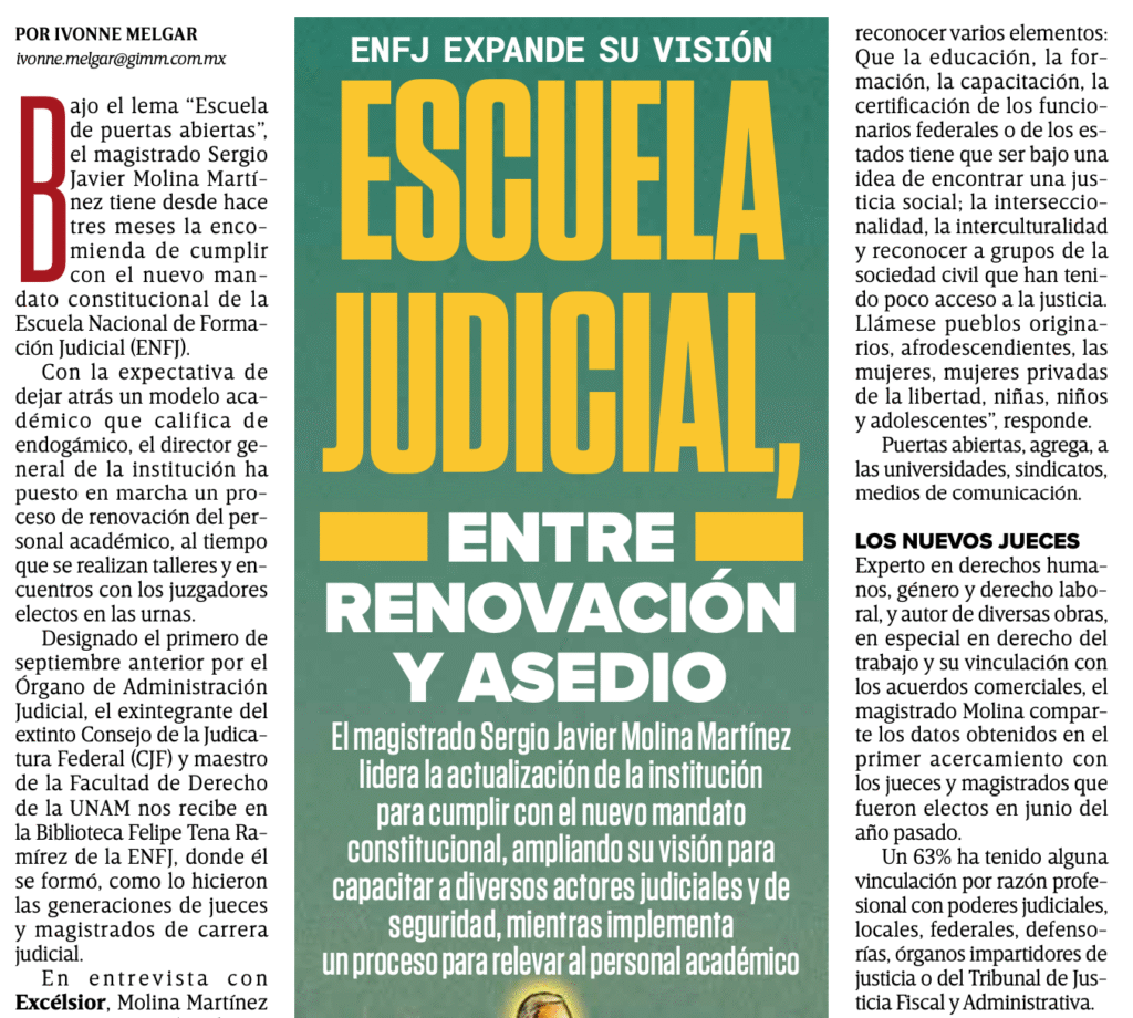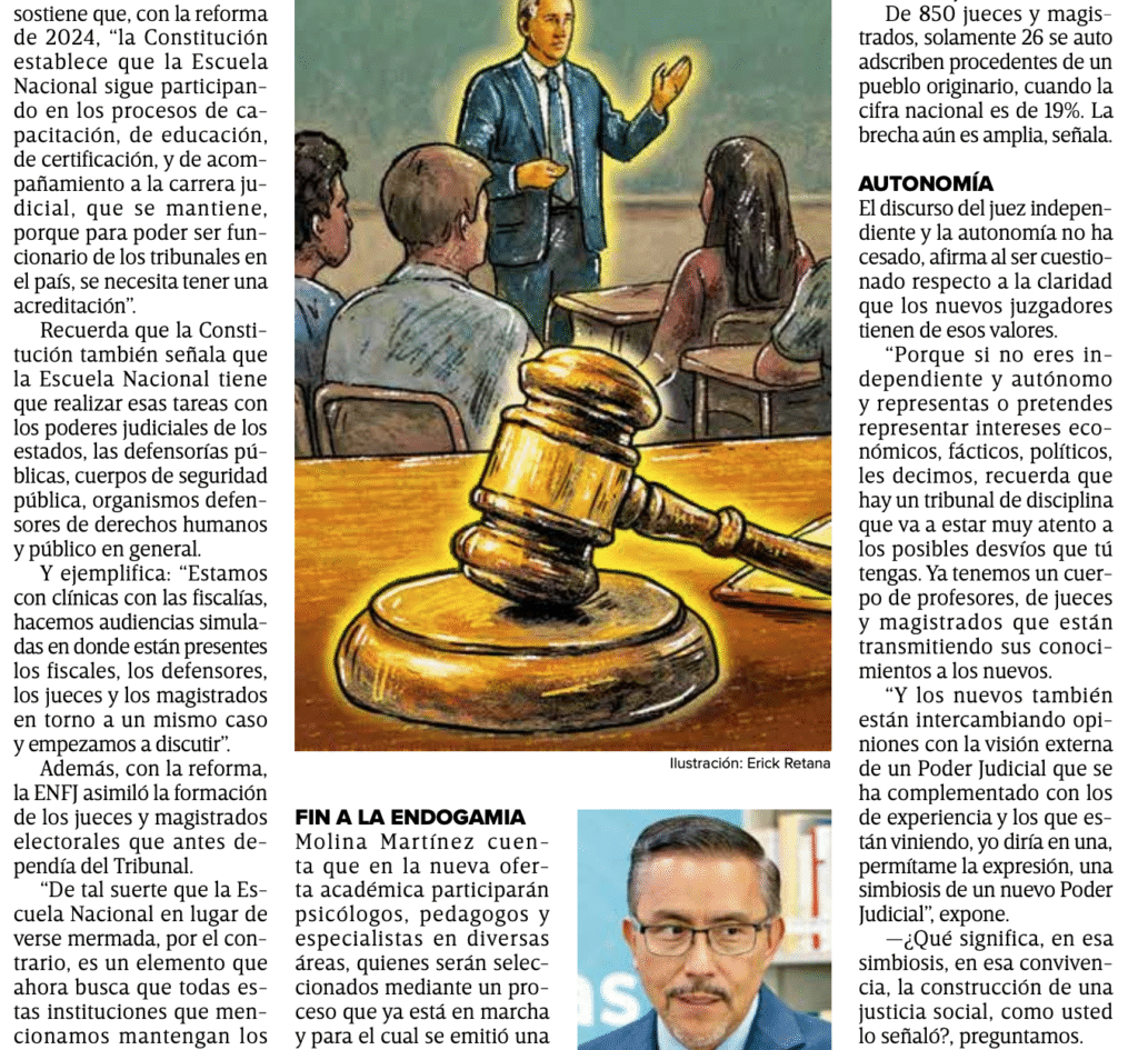 Bajo el lema “Escuela de puertas abiertas”, el magistrado Sergio Javier Molina Martínez tiene desde hace tres meses la encomienda de cumplir con el nuevo mandato constitucional de la Escuela Nacional de Formación Judicial (ENFJ).