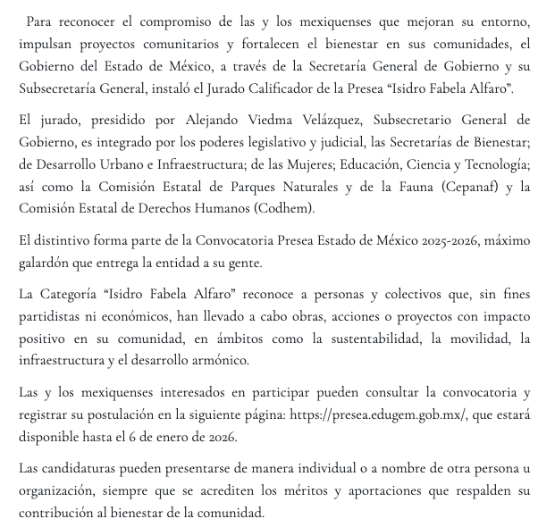 - https://diarioportal.com/gobierno/presea-isidro-fabela-alfaro-impulsa-proyectos-comunitarios-gobierno-del-edomex-invita-a-participar?fbclid=IwY2xjawOH5d1leHRuA2FlbQIxMQBzcnRjBmFwcF9pZBAyMjIwMzkxNzg4MjAwODkyCGNhbGxzaXRlAjMwAAEeCVZL7aSljH4Dw5HNM3s4QGNqNZdZZ6PqXsf6fOxqHKwZTtI9ec7tvxHsSWE_aem_QoHt98DWbY4Px6Xi1SLsyA