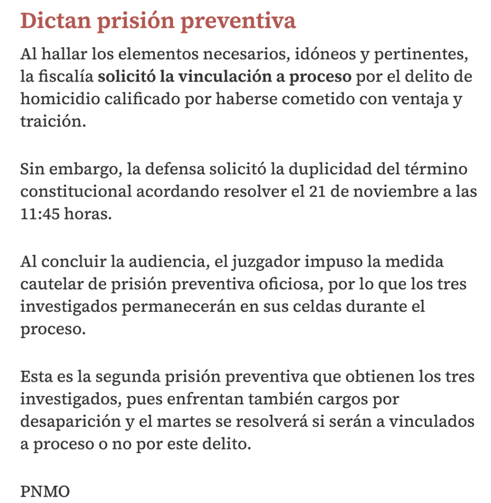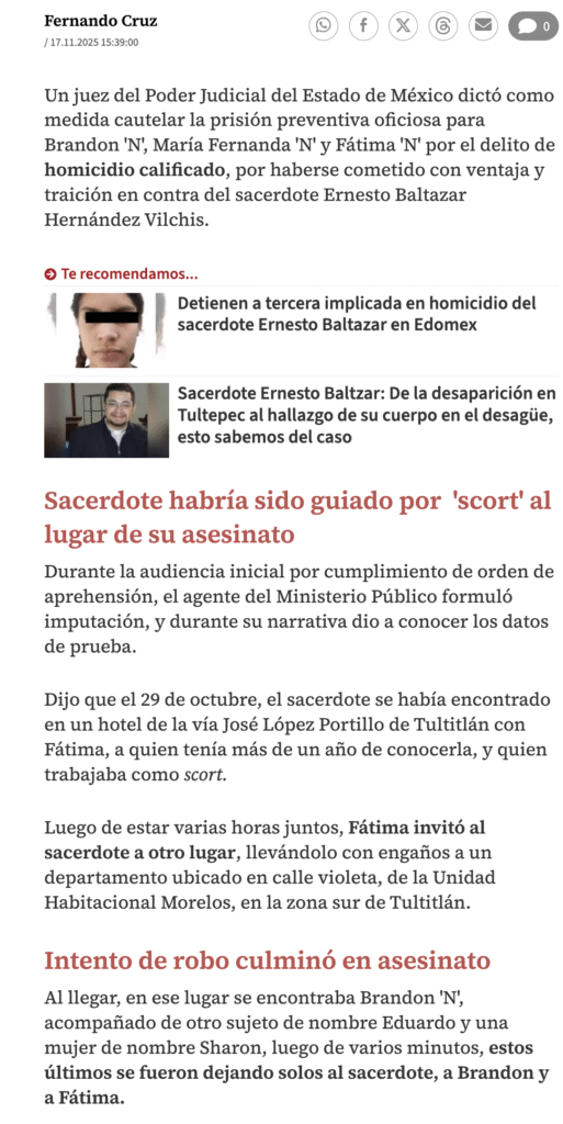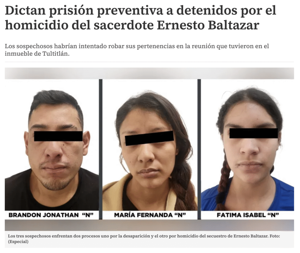 Un juez del Poder Judicial del Estado de México dictó como medida cautelar la prisión preventiva oficiosa para Brandon ‘N’, María Fernanda ‘N’ y Fátima ‘N’ por el delito de homicidio calificado, por haberse cometido con ventaja y traición en contra del sacerdote Ernesto Baltazar Hernández Vilchis.