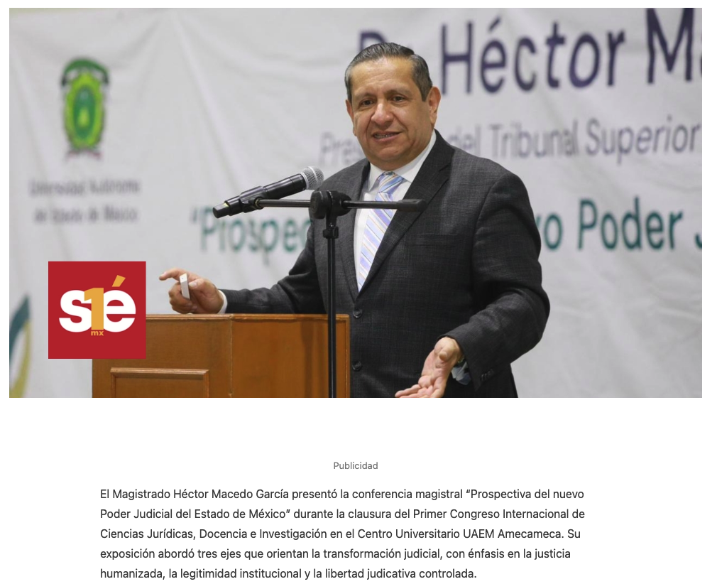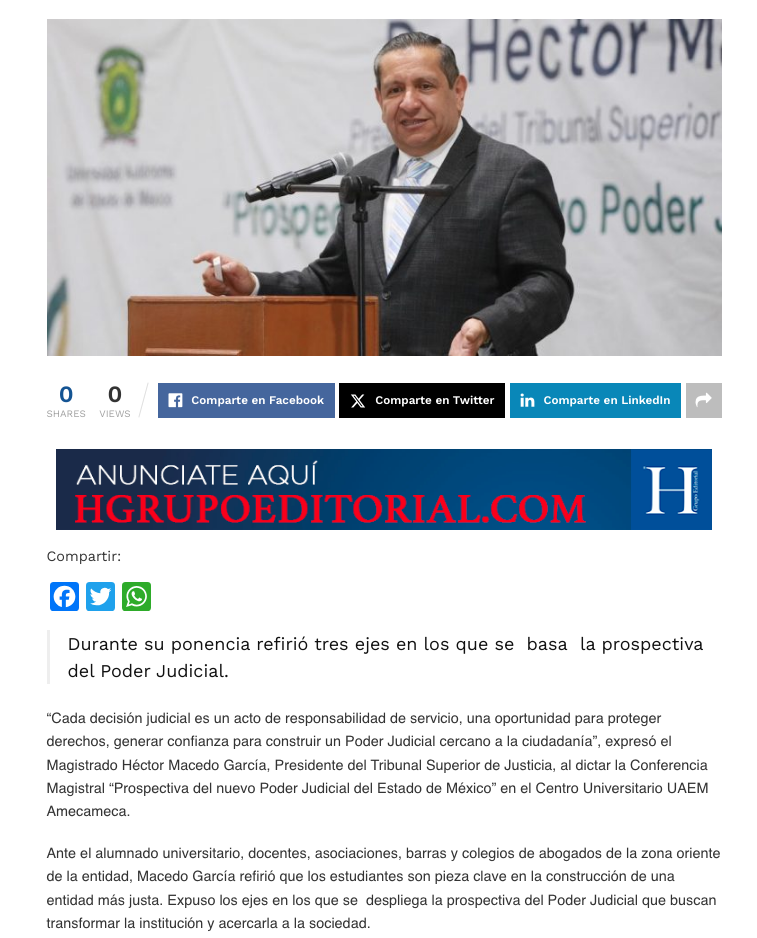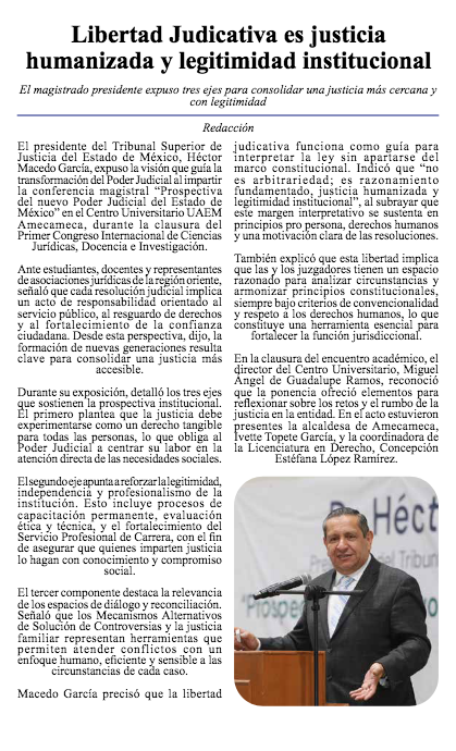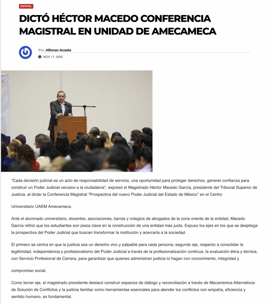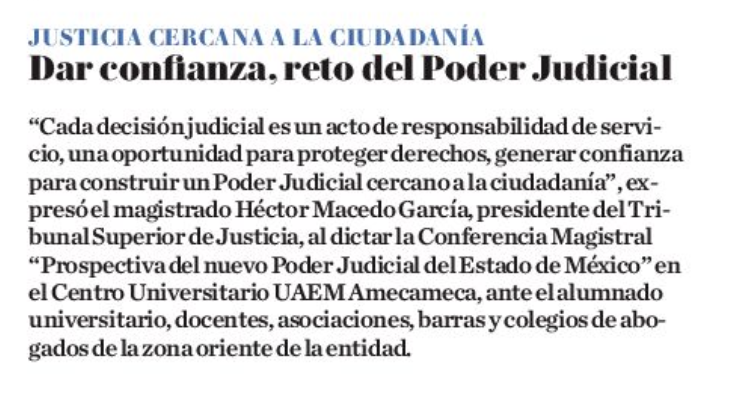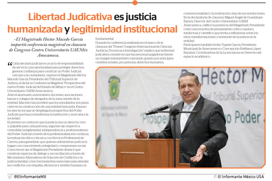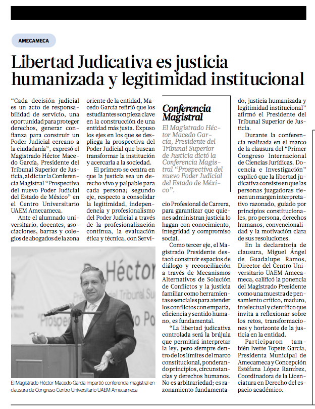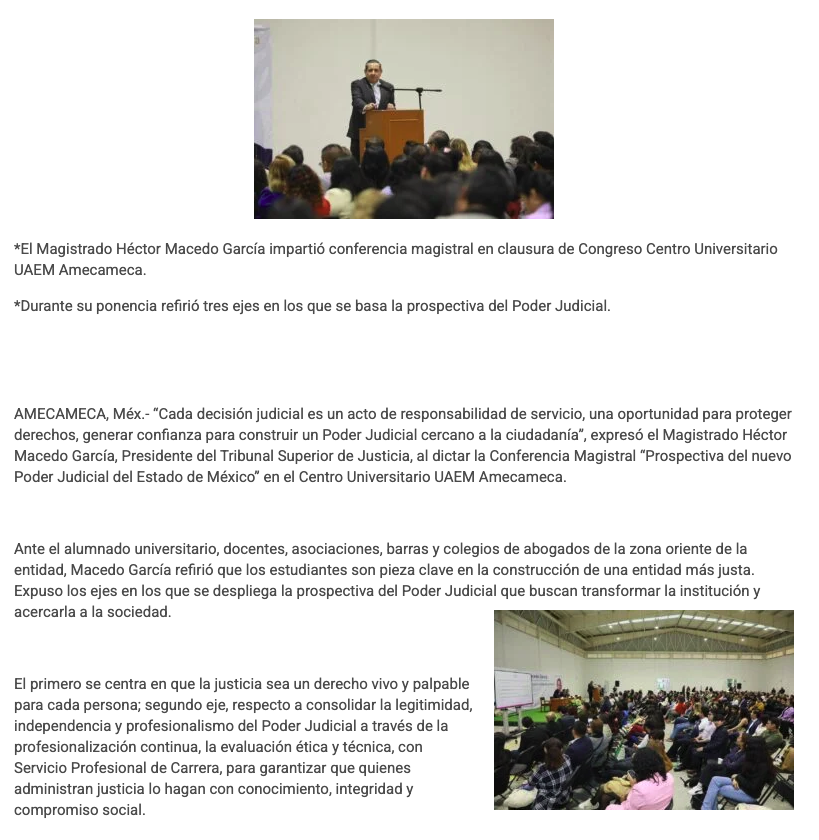 “Cada decisión judicial es un acto de responsabilidad de servicio, una oportunidad para proteger derechos, generar confianza para construir un Poder Judicial cercano a la ciudadanía”, expresó el Magistrado Héctor Macedo García, Presidente del Tribunal Superior de Justicia, al dictar la Conferencia Magistral “Prospectiva del nuevo Poder Judicial del Estado de México” en el Centro Universitario UAEM Amecameca.