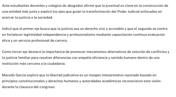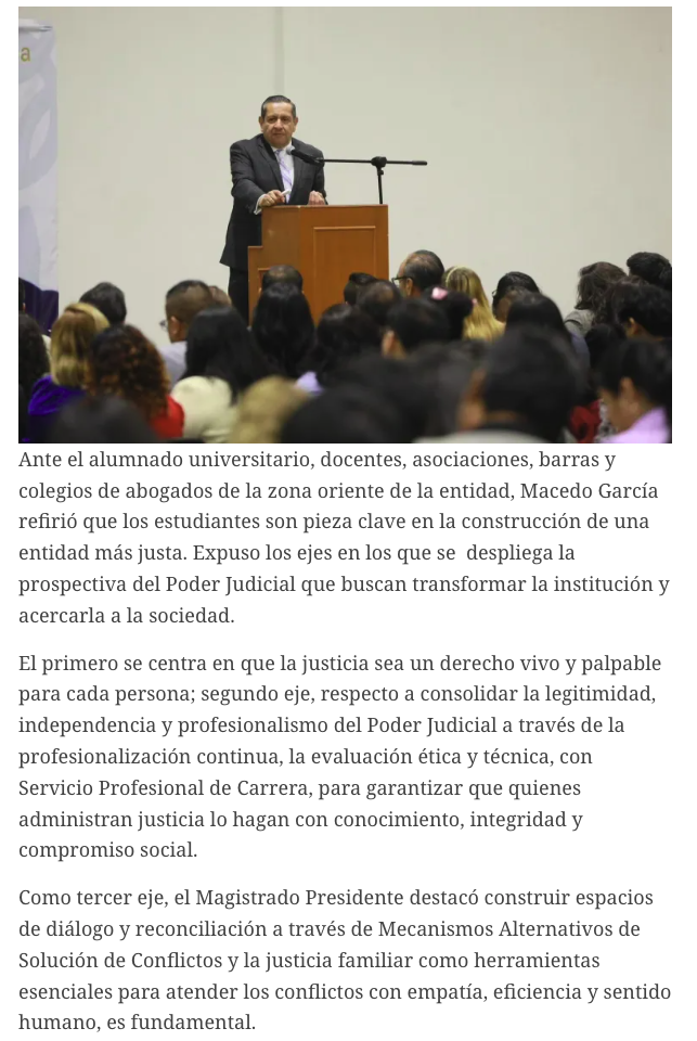 Ante el alumnado universitario, docentes, asociaciones, barras y colegios de abogados de la zona oriente de la entidad, Macedo García refirió que los estudiantes son pieza clave en la construcción de una entidad más justa. Expuso los ejes en los que se despliega la prospectiva del Poder Judicial que buscan transformar la institución y acercarla a la sociedad.
