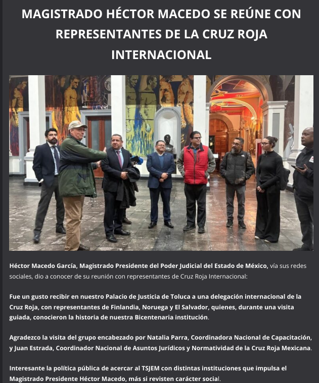 Héctor Macedo García, Magistrado Presidente del Poder Judicial del Estado de México, vía sus redes sociales, dio a conocer de su reunión con representantes de Cruz Roja Internacional: