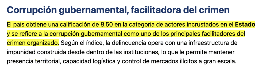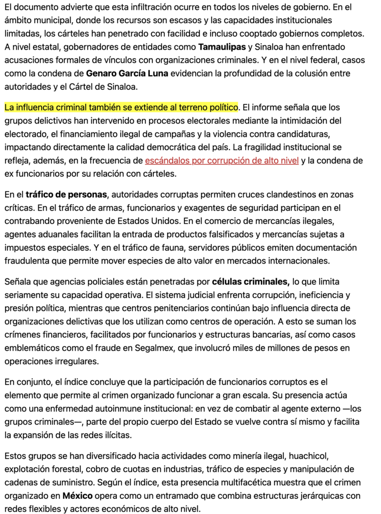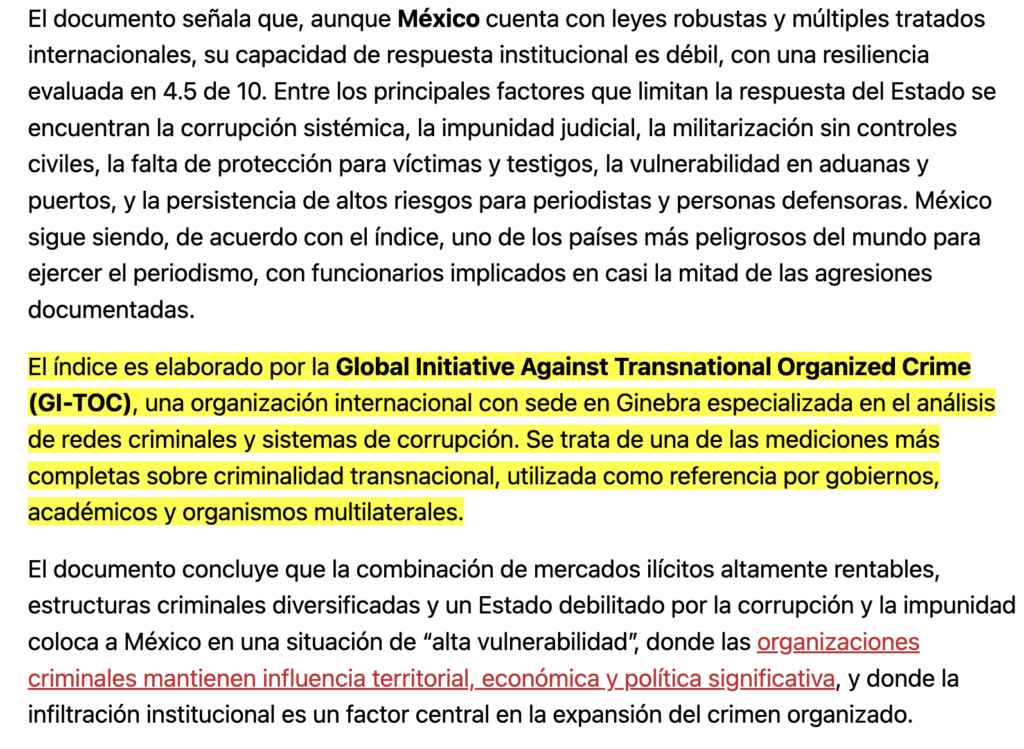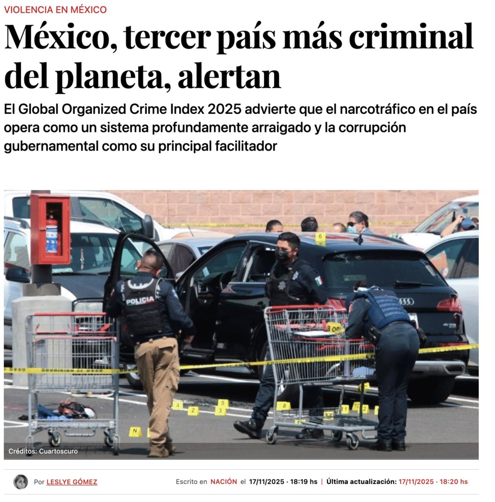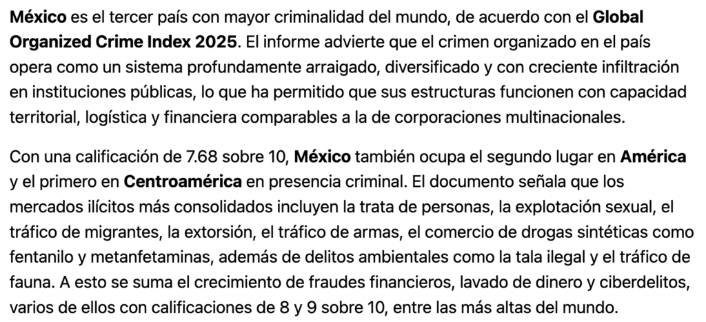 México es el tercer país con mayor criminalidad del mundo, de acuerdo con el Global Organized Crime Index 2025. El informe advierte que el crimen organizado en el país opera como un sistema profundamente arraigado, diversificado y con creciente infiltración en instituciones públicas, lo que ha permitido que sus estructuras funcionen con capacidad territorial, logística y financiera comparables a la de corporaciones multinacionales.