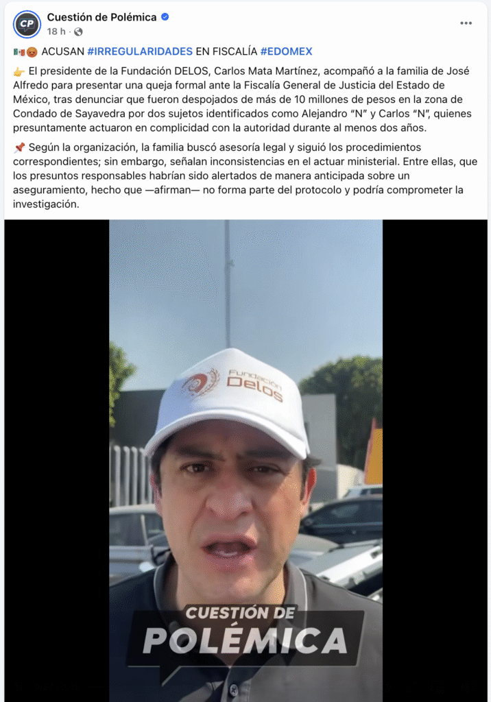 El presidente de la Fundación DELOS, Carlos Mata Martínez, acompañó a la familia de José Alfredo para presentar una queja formal ante la Fiscalía General de Justicia del Estado de México, tras denunciar que fueron despojados de más de 10 millones de pesos en la zona de Condado de Sayavedra por dos sujetos identificados como Alejandro “N” y Carlos “N”, quienes presuntamente actuaron en complicidad con la autoridad durante al menos dos años.
