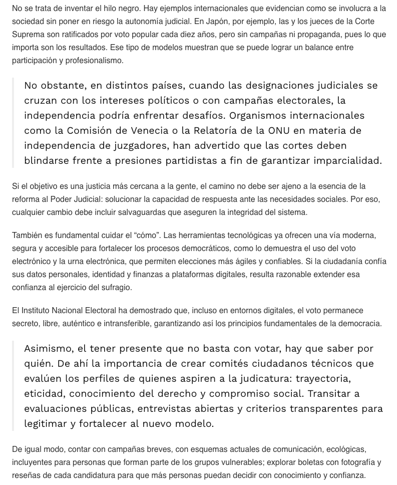 Hoy se discute la instauración de un modelo de elección popular del Poder Judicial en México. Este escenario no busca convertir a los tribunales en arenas electorales, sino en diseñar un sistema que combine la legitimidad democrática con independencia judicial y que garantice transparencia, rendición de cuentas e imparcialidad. La realidad es que no basta con elegir: hay que hacerlo bien, con responsabilidad y con información.