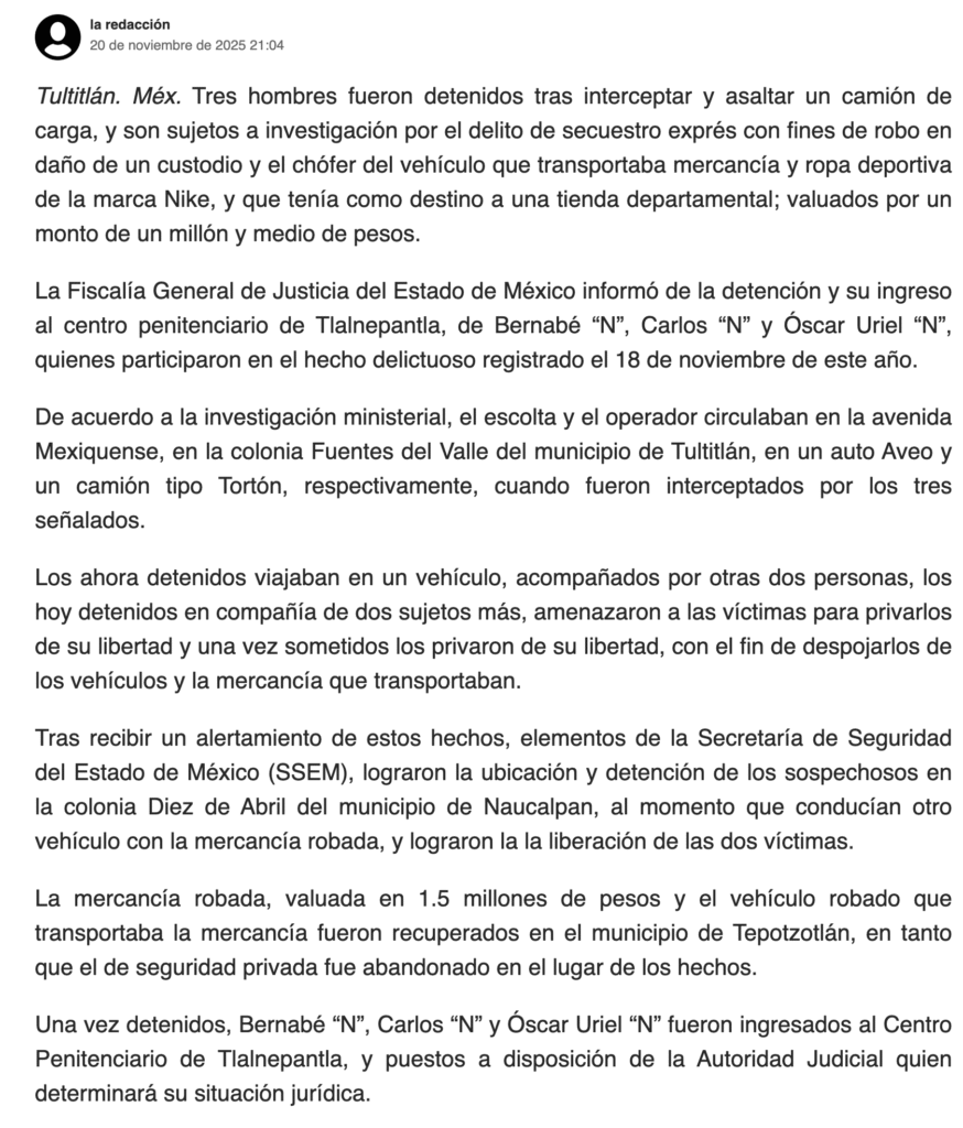 • https://www.jornada.com.mx/noticia/2025/11/20/estados/caen-3-presuntos-responsables-de-asalto-y-secuestro-expres-en-tultitlan