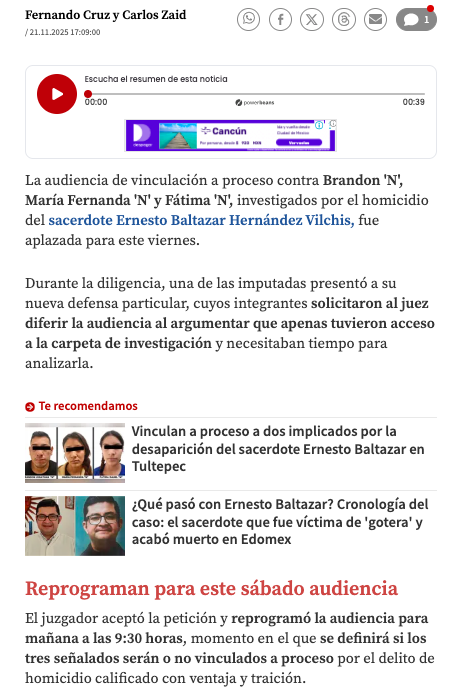 • https://www.milenio.com/policia/homicidio-del-sacerdote-ernesto-baltazar-aplazan-audiencia-implicados