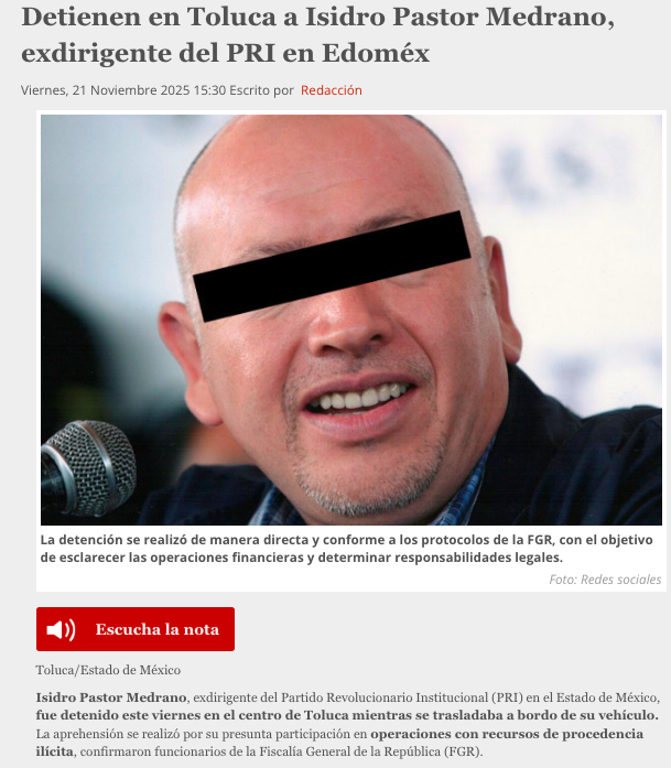 - https://digitalmex.mx/seguridad/story/63087/detienen-toluca-isidro-pastor-medrano-exdirigente-pri-edomex