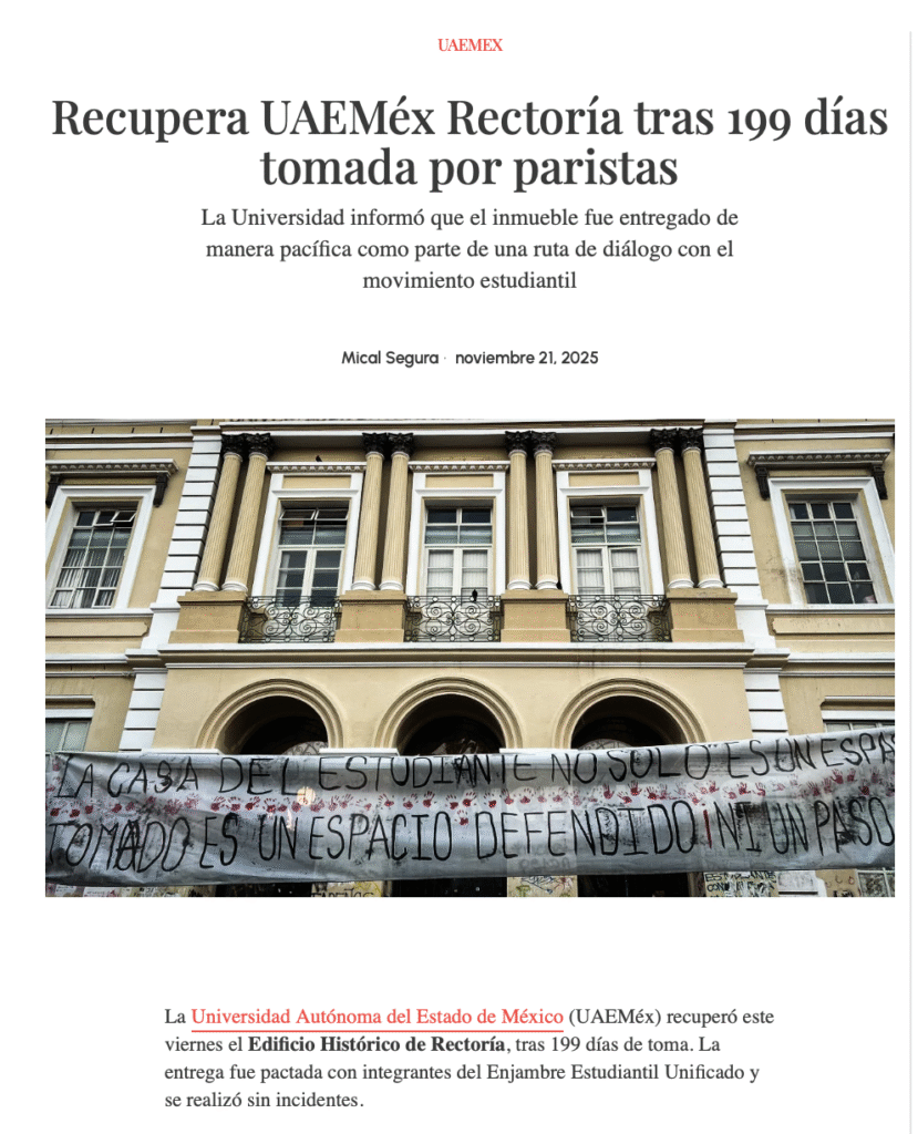 La Universidad Autónoma del Estado de México (UAEMéx) recuperó este viernes el Edificio Histórico de Rectoría, tras 199 días de toma. La entrega fue pactada con integrantes del Enjambre Estudiantil Unificado y se realizó sin incidentes.