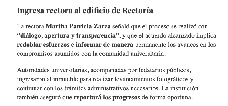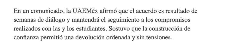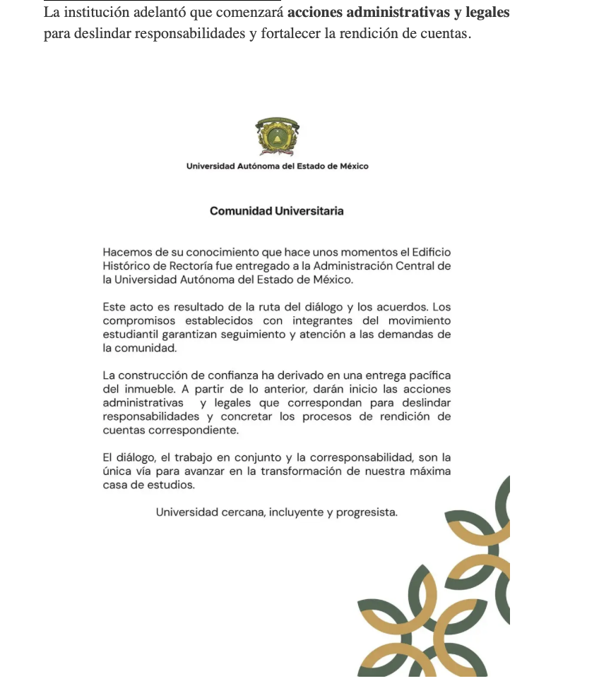 En un comunicado, la UAEMéx afirmó que el acuerdo es resultado de semanas de diálogo y mantendrá el seguimiento a los compromisos realizados con las y los estudiantes. Sostuvo que la construcción de confianza permitió una devolución ordenada y sin tensiones.
