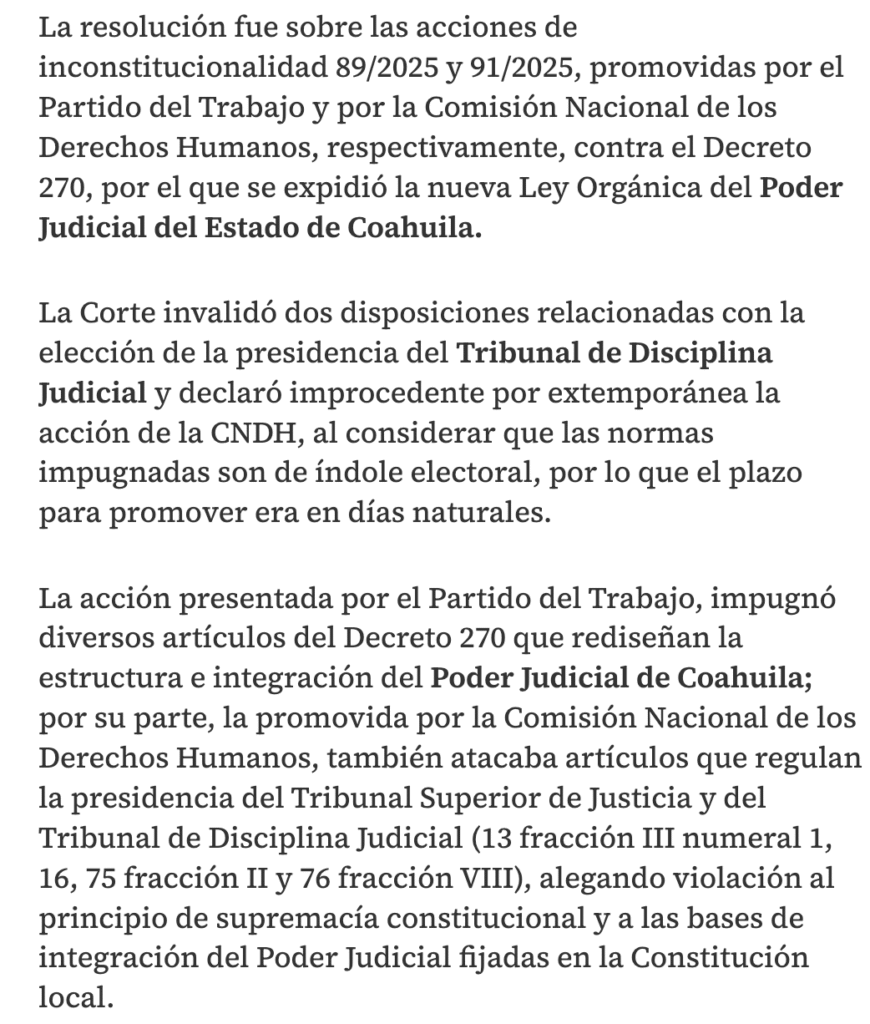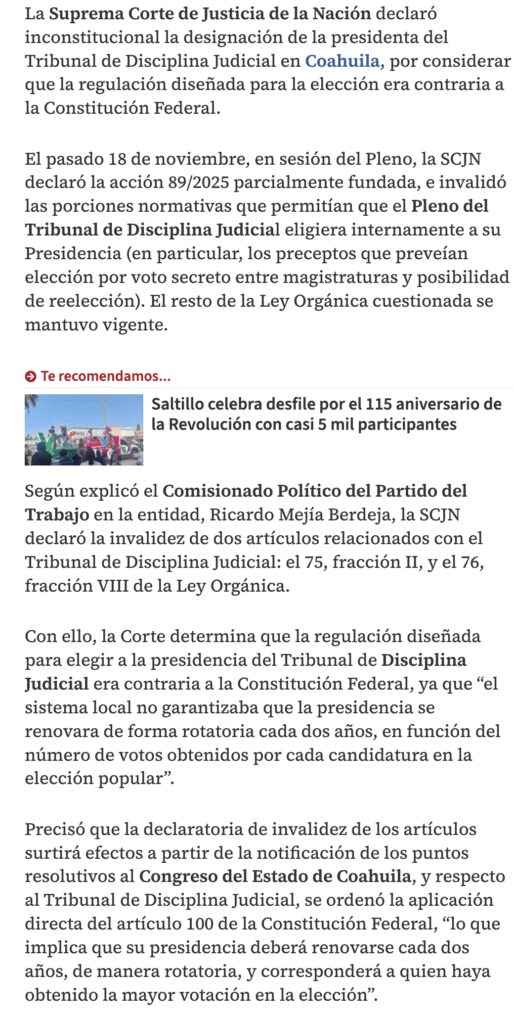 La Suprema Corte de Justicia de la Nación declaró inconstitucional la designación de la presidenta del Tribunal de Disciplina Judicial en Coahuila, por considerar que la regulación diseñada para la elección era contraria a la Constitución Federal.