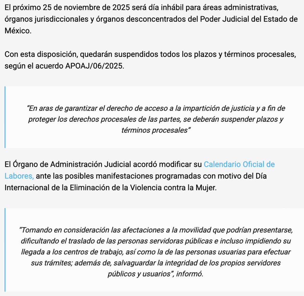 El próximo 25 de noviembre será día inhábil para áreas administrativas , órganos jurisdiccionales y órganos desconcentrados del Poder Judicial del Estado de México.
