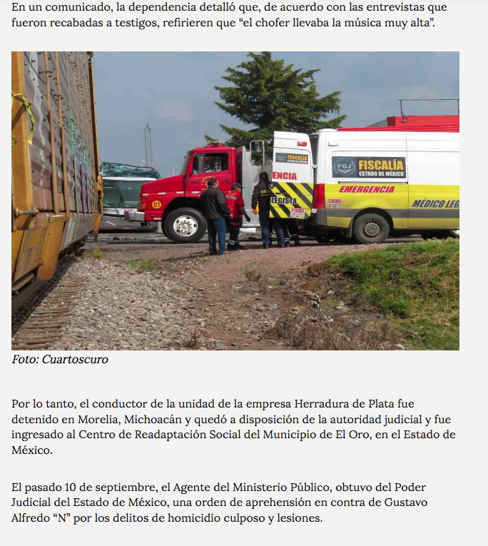 {..} Por lo tanto, el conductor de la unidad de la empresa Herradura de Plata fue detenido en Morelia, Michoacán y quedó a disposición de la autoridad judicial y fue ingresado al Centro de Readaptación Social del Municipio de El Oro, en el Estado de México.