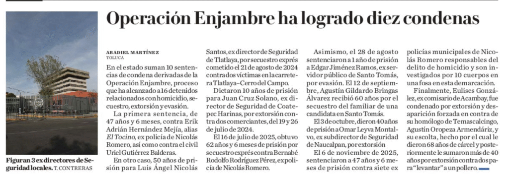 En el estado suman 10 sentencias de condena derivadas de la Operación Enjambre, proceso que ha alcanzado a 16 detenidos relacionados con homicidio, secuestro, extorsión y evasión.