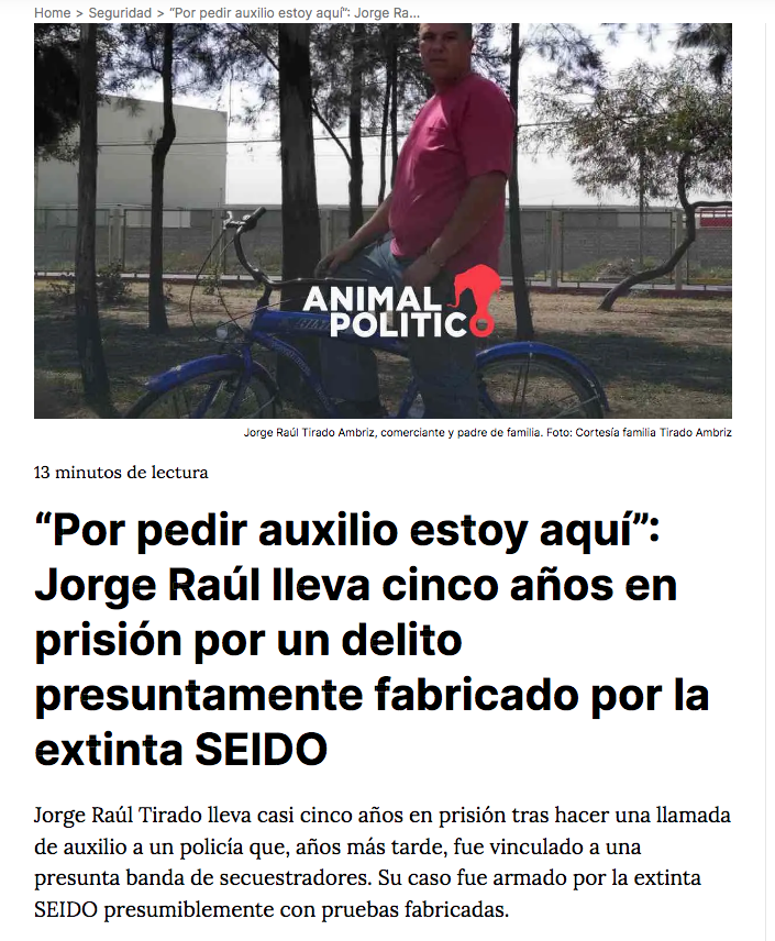 Por hacer una llamada de auxilio a un policía, que tiempo después fue relacionado con una presunta banda de secuestradores, Jorge Raúl Tirado Ambriz, comerciante y padre de familia, lleva casi cinco años en la cárcel por un delito presumiblemente fabricado por autoridades de la extinta Subprocuraduría Especializada en Investigación de Delincuencia Organizada (SEIDO) de la desaparecida Procuraduría General de la República (PGR).