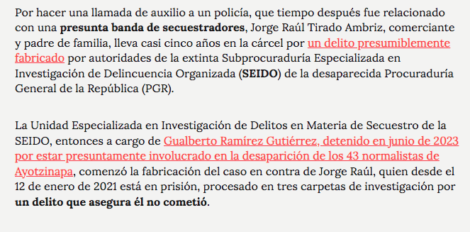 La Unidad Especializada en Investigación de Delitos en Materia de Secuestro de la SEIDO, entonces a cargo de Gualberto Ramírez Gutiérrez, detenido en junio de 2023 por estar presuntamente involucrado en la desaparición de los 43 normalistas de Ayotzinapa, comenzó la fabricación del caso en contra de Jorge Raúl, quien desde el 12 de enero de 2021 está en prisión, procesado en tres carpetas de investigación por un delito que asegura él no cometió.