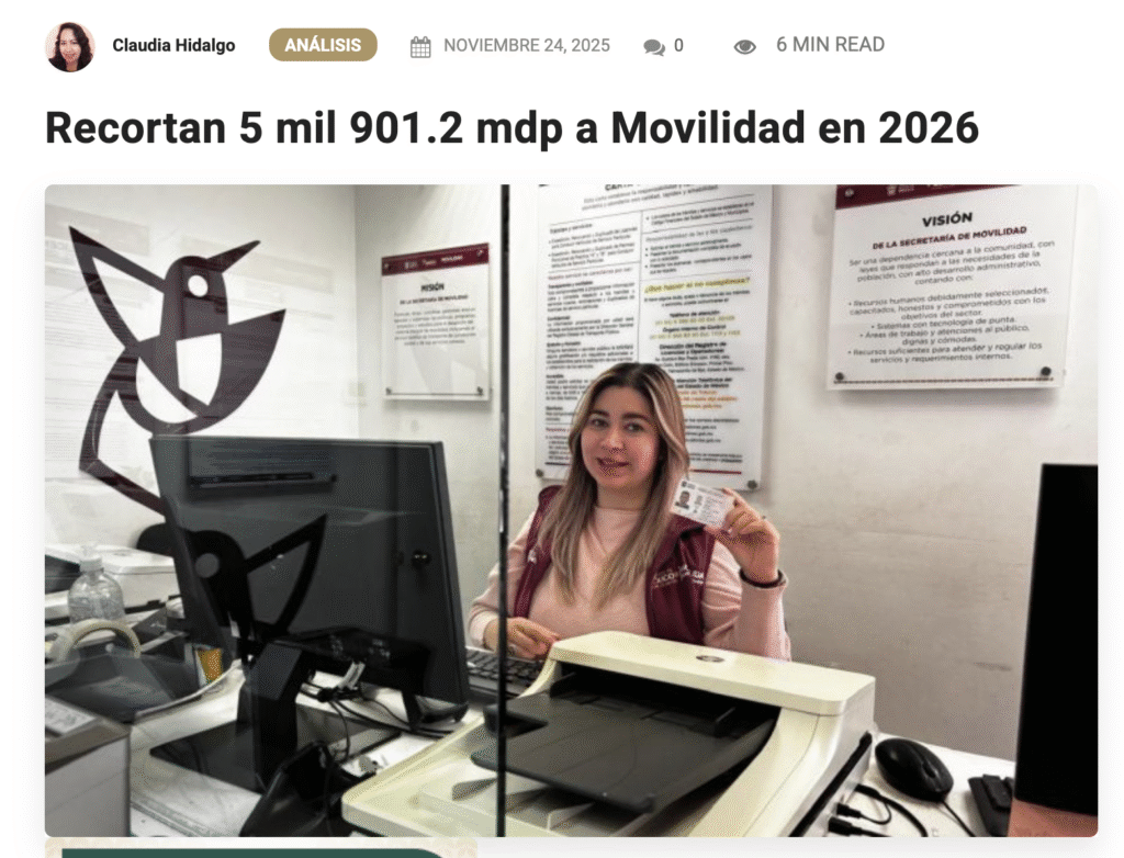 Recortan 5 mil 901.2 mdp a Movilidad en 2026