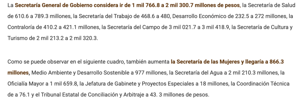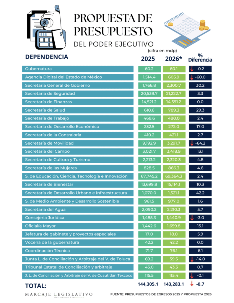 La planeación presupuestal para el 2026 contempla un recorte de 64.19 por ciento a la Secretaría de Movilidad que de 9 mil 192.9 millones pasaría a sólo 3mil 291.7 millones de pesos y más de 69 mil 364.3 millones de pesos para la Secretaría de Educación, Ciencia, Tecnología e Innovación que representan 48.37 por ciento del total de los recursos que el Poder Ejecutivo podría manejar durante el siguiente ejercicio fiscal.