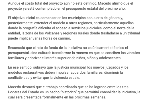 En entrevista, su magistrado presidente, Héctor Macedo García, anunció que durante el primer trimestre del próximo año comenzarán a implementar un modelo de justicia municipal con juzgados de proximidad y un nuevo “Juzgado Libre”, diseñado para emitir órdenes de protección inmediatas en casos de violencia familiar, sin que la víctima tenga que desplazarse a un tribunal y sin intermediación de otras autoridades.