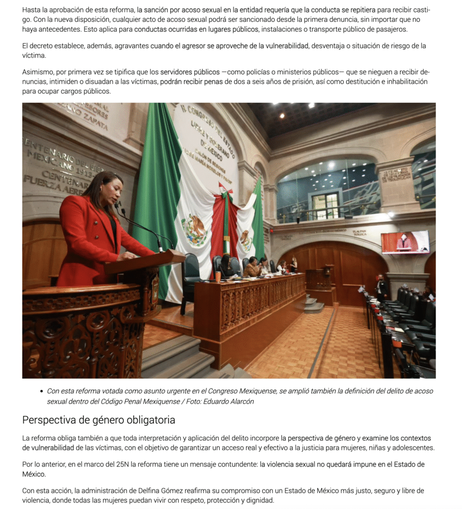 En el marco del Día Internacional de la Eliminación de la Violencia contra las Mujeres, el Gobierno del Estado de México destacó un avance crucial en la protección de los derechos de las mujeres: la iniciativa de reforma al Código Penal enviada al Congreso Local el pasado 9 de noviembre por la Gobernadora Delfina Gómez Álvarez, que endurece las sanciones por acoso sexual y garantiza justicia desde la primera denuncia, y que fue aprobada por unanimidad el 13 del mismo mes.